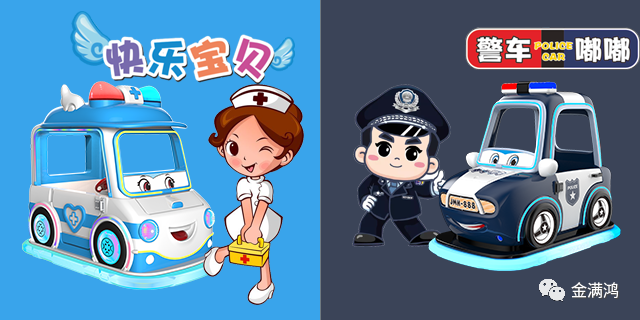 现在守护和平和维持治安主题的广场车很符合儿童的审美和向往,和平的象征、救护的小天使-快乐宝贝,维持治安的警车造型-警车嘟嘟,深得小朋友的喜爱。